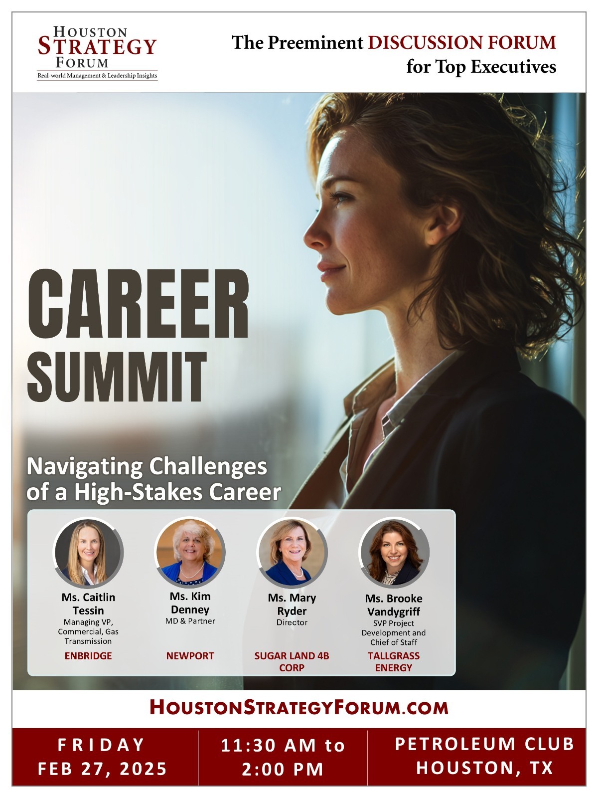 While climbing the corporate ladder is difficult for men, it is often even more challenging for women. The Houston Strategy Forum is inviting top women leaders who persevered and succeeded in their careers. Join us for an off-the-record, candid discussion with leaders who can help advance and shape your career.